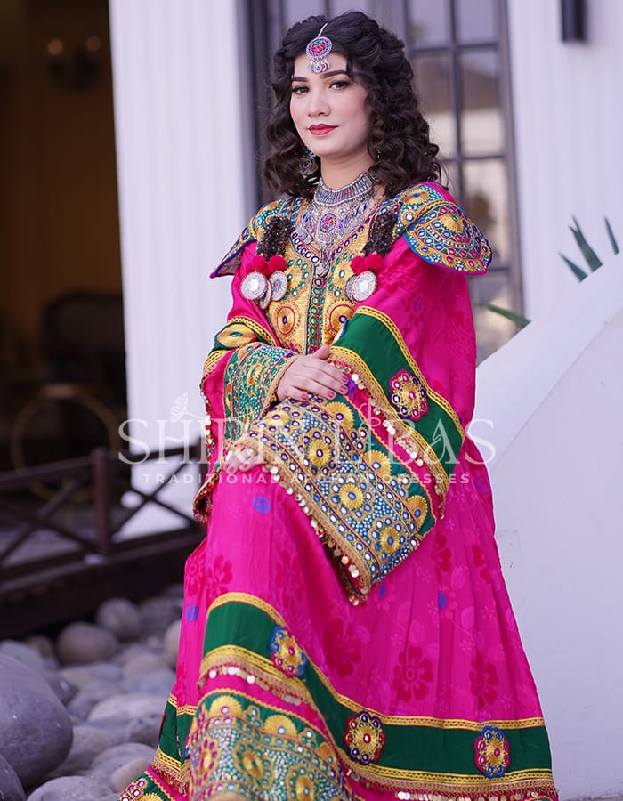 This exquisite dress features intricate “zartar” and “charma dozi” work adorning the skirt, waist, and sleeves. An elegant, embroidered organza scarf complements the dress, which is paired with comfortable “lalmiton” pants.