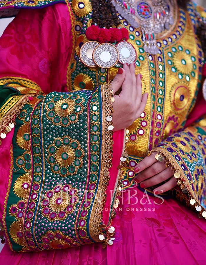This vibrant dress features intricate “charma dozi” and mirror work on the skirt, waist, and sleeves. The chest is beautifully embellished with mirrors, coins, and buttons. A colorful, multi-color scarf complements the dress, which is paired with comfortable “lalmiton” pants.