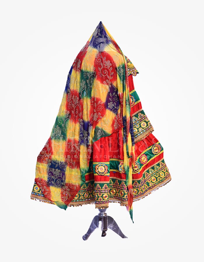 Enchanting skirt with intricate bead and mirror work adorning waist and sleeves. Paired with a luxurious shafon scarf embellished with beads and elegant yellow lalmiton pants. A timeless ensemble for the discerning woman.