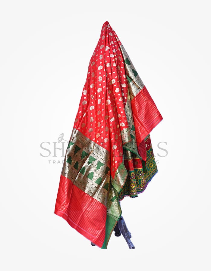 Enchanting ensemble! Vibrant red Banaras paired with a green skirt adorned with exquisite Zartar and mirror work. Includes a pure Banaras scarf and regal red Lalmiton pants. A timeless masterpiece.
