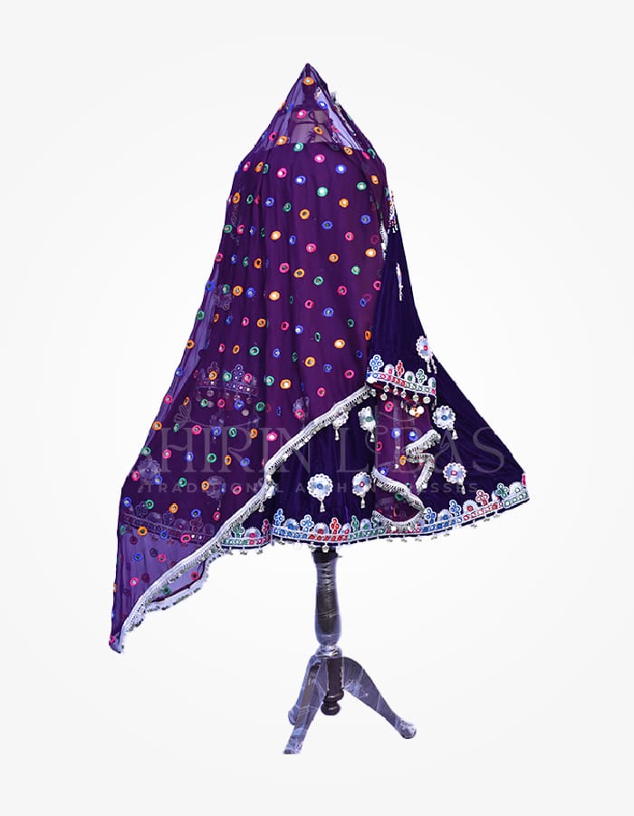 Enchanting ensemble featuring a purple skirt & sleeves adorned with delicate Zartar & mirror work. Paired with vibrant Lalmiton pants and a multi-color scarf embellished with sparkling Sitara lace. A fusion of elegance and tradition.