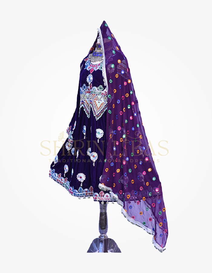 Enchanting purple bakhmal skirt with dazzling white zartar mirror work, embellished with intricate beadwork and Gul Mekhy. Coin accents and Sitara lace border on the scarf complete this elegant ensemble.