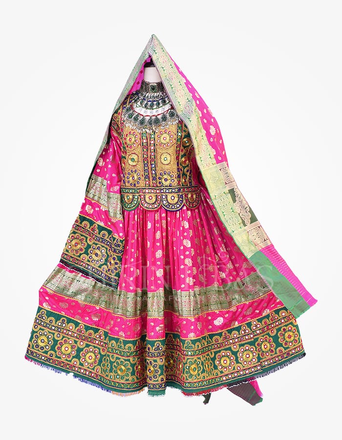 Enchanting green ensemble featuring intricate Zartar & mirror work on the skirt, sleeves, and waist. Paired with elegant lalmiton pants and a graceful green scarf.