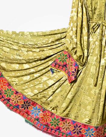 This vibrant dress features intricate “charma dozi” and mirror work on the skirt, waist, and sleeves. The chest is beautifully embellished with mirrors, coins, and buttons. A colorful, multi-color scarf complements the dress, which is paired with comfortable “lalmiton” pants.
