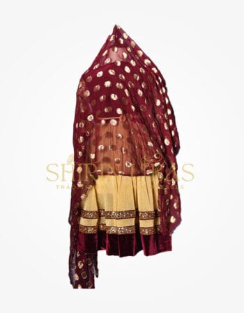 This elegant dress features intricate “charma dozi” work on the skirt, waist, and sleeves. A beautiful Banarasi scarf complements the dress, which is paired with comfortable silk pants.